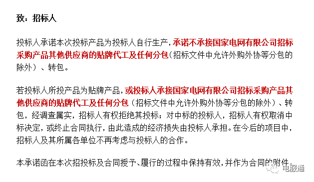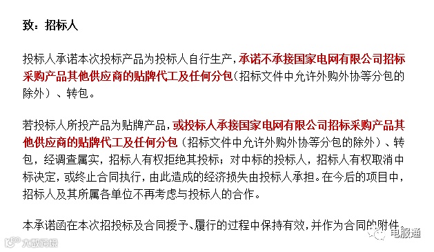 如果说国网发布严禁贴牌代工行为公告是一次郑重警告,那么在总部电表箱的招标中就已经出台了明确规定,文件中的承诺函如下: