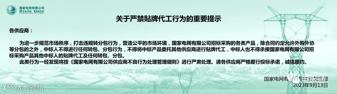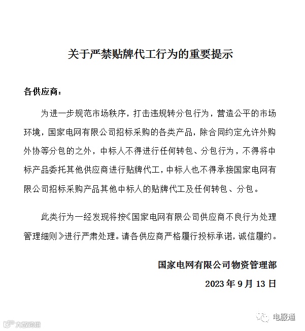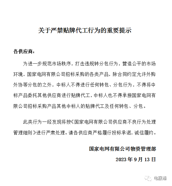 2023年9月13日,国家电网发布了:关于严禁贴牌代工行为重要提示公告;