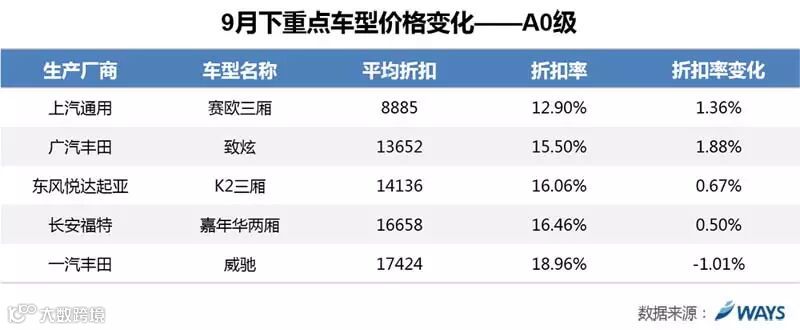 【】A0级市场中,广汽丰田致炫9月增加了置换、金融补贴和超目标奖励,9月折扣率上升了1.88%,部分经销商表示购车目标客户期待车展优惠,成交率偏低;赛欧三厢第三季度冲量,9月折扣率上升1.36%;东风悦达起亚通过增加超额奖励和提车奖励支持K2三厢销售,9月折扣率上升0.67%;长安福特嘉年华两厢9月增加了对销售人员的奖励和赠送油卡支持销售,折扣率上升0.5%;一汽丰田经销商反馈,受天津港爆炸影响,威驰生产放缓,库存偏少,加上9月取消了上牌奖励,折扣率下降1.01%。