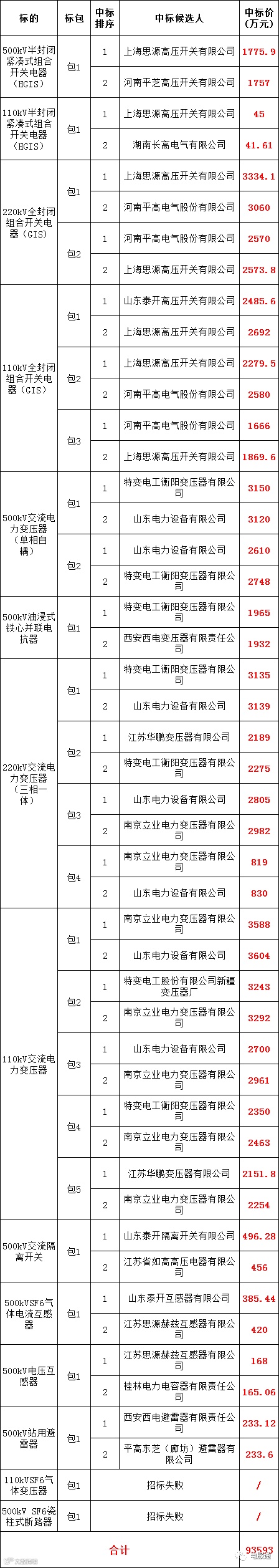 南方电网公司2023年主网一次设备第三批批次招标项目,经评标委员会评审,现将中标候选人公示如下: