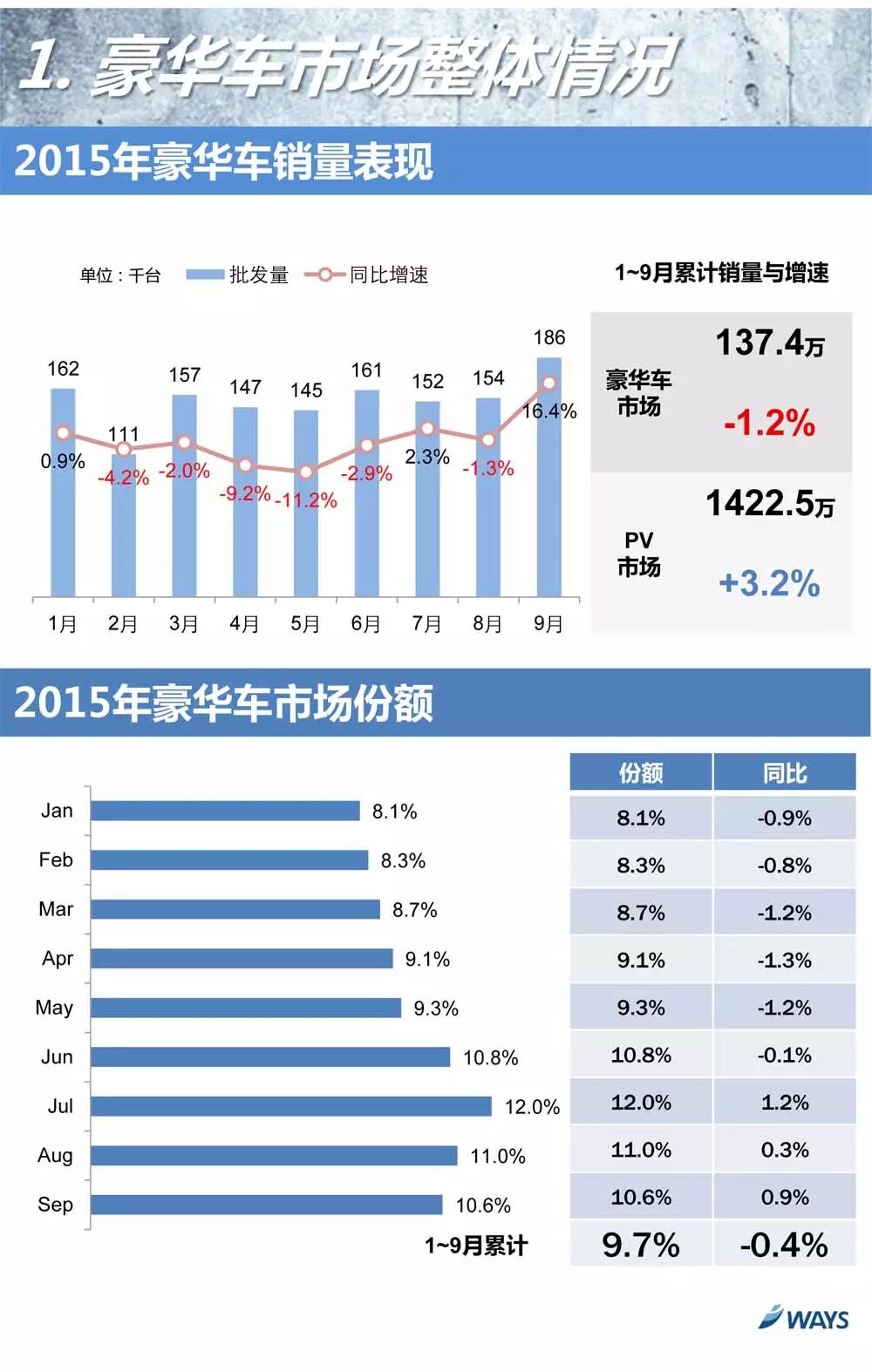 2015年豪华车市场总体表现较弱,累计销量同比下降1.2%;从月度表现来看,自6月开始豪华车销量有所好转,9月强势反弹,同比上升16.4%,超出市场预期。