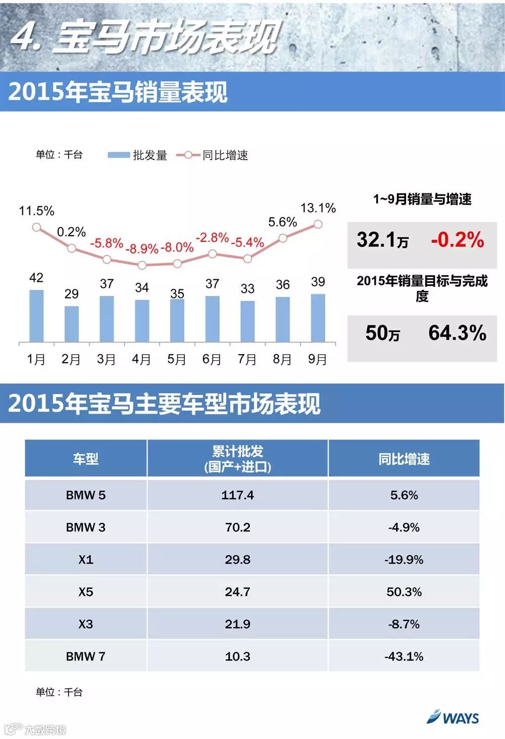 受上半年销量表现低迷影响,宝马今年前三季度销量同比收跌,由于年初设定目标较为乐观,销量完成度不高;从车型来看,仅X5与5系同比增长。