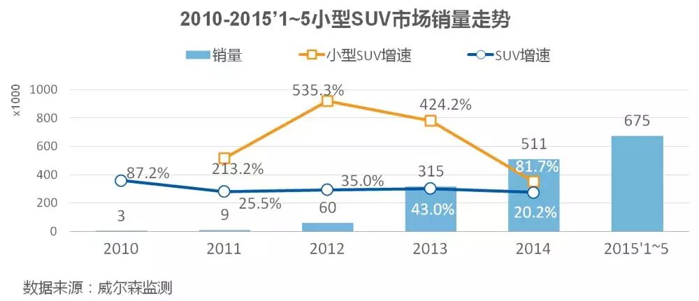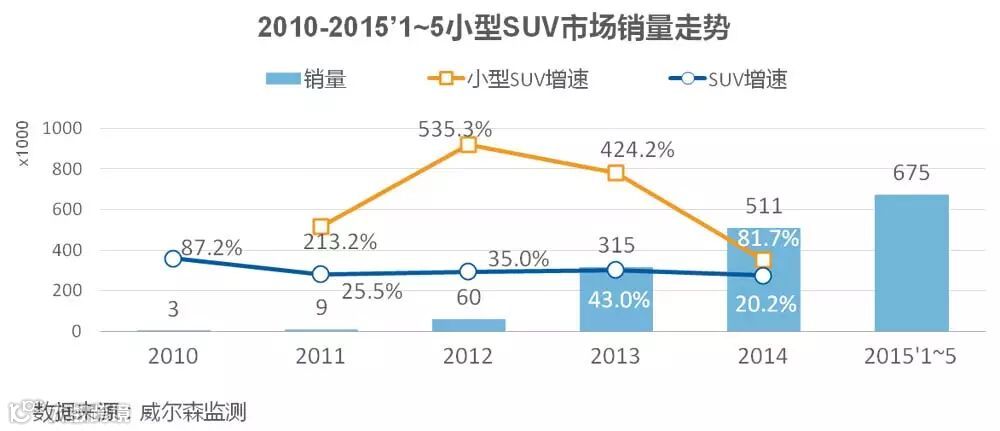 【】回顾小型SUV的发展历程,年轻且生机蓬勃。2012年国产小型SUV市场萌芽,近年来保持远高于SUV市场的爆发式增长速度,单2015年前5月的销量已超过了2014年全年。同时2014年下半年上市的车型尚处于发展期,2015年也涌现大量全新车型,市场将进一步扩大,我们也可大胆预测小型SUV市场将持续高速扩张。