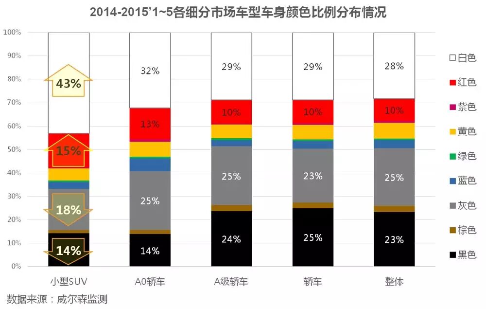 【】毫无疑问,年轻生力军更崇尚活力,目光永远追随亮丽色彩。相比其他细分市场,小型SUV的消费者更加偏好亮色调,选择亮色调(白色和红色)的比例也明显高于暗色调(黑色和灰色),且个性十足的撞色车顶也大受好评。