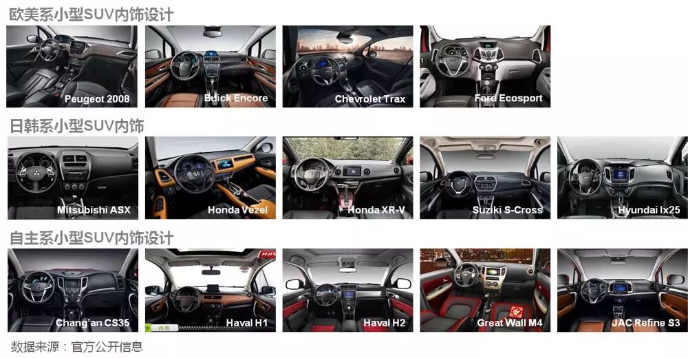 【】外观悦人,内饰才是真正的“悦己”,动感而不拘一格的内饰设计是小型SUV另一特色亮点。新上市的缤智、XR-V、2008、ix25等车型在内饰中控设计、布局方面跳出常规,凸显个性,且整体多采用运动黑色为基调,辅以黄色、蓝色、棕色、红色等颜色搭配,活力十足。