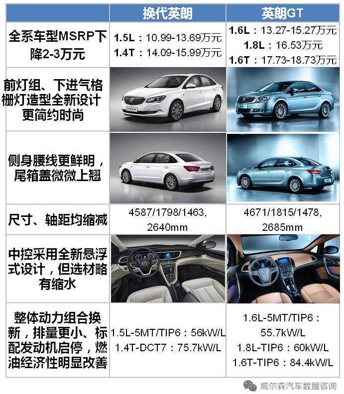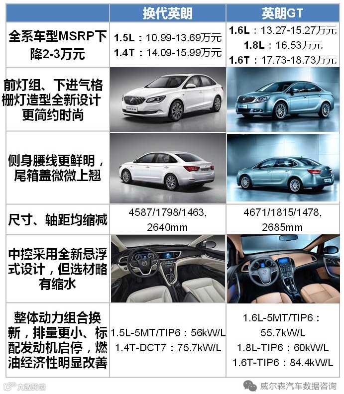 3月2日,换代英朗上市,共9款车型,将替换三厢的英朗GT。换代英朗价格下调,尺寸、轴距缩减,内外设计细腻化,动力全面革新,配置有所调整,竞争力大幅提升。