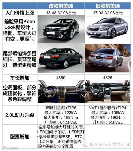1月10日,广汽丰田改款凯美瑞上市,搭载3种动力系统、共9款车型。新车2.0L版车型的全新发动机和变速箱增加了新车的产品竞争力。