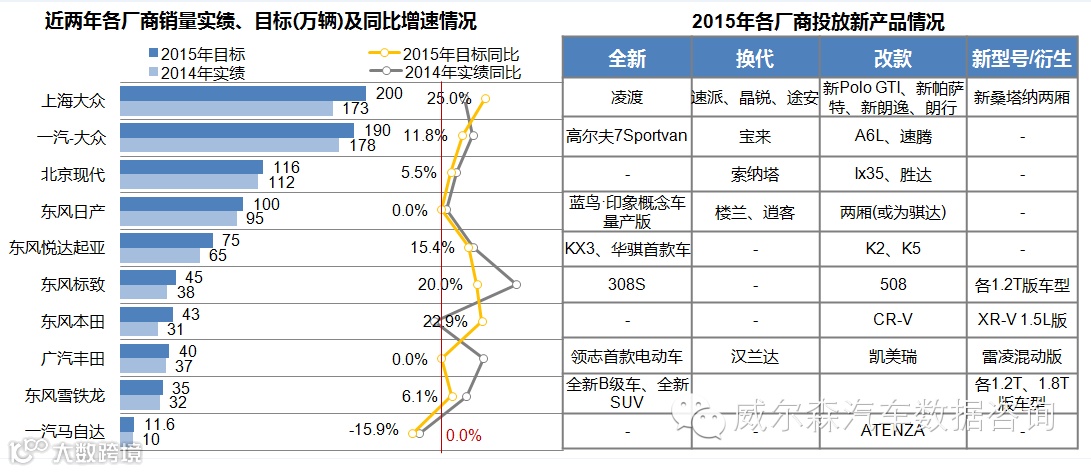 据目前各厂商已公开的2015年销量目标显示,除上海大众外,各厂商设定的目标均较为保守。在产品投放方面,仍继续规划新产品的投放。