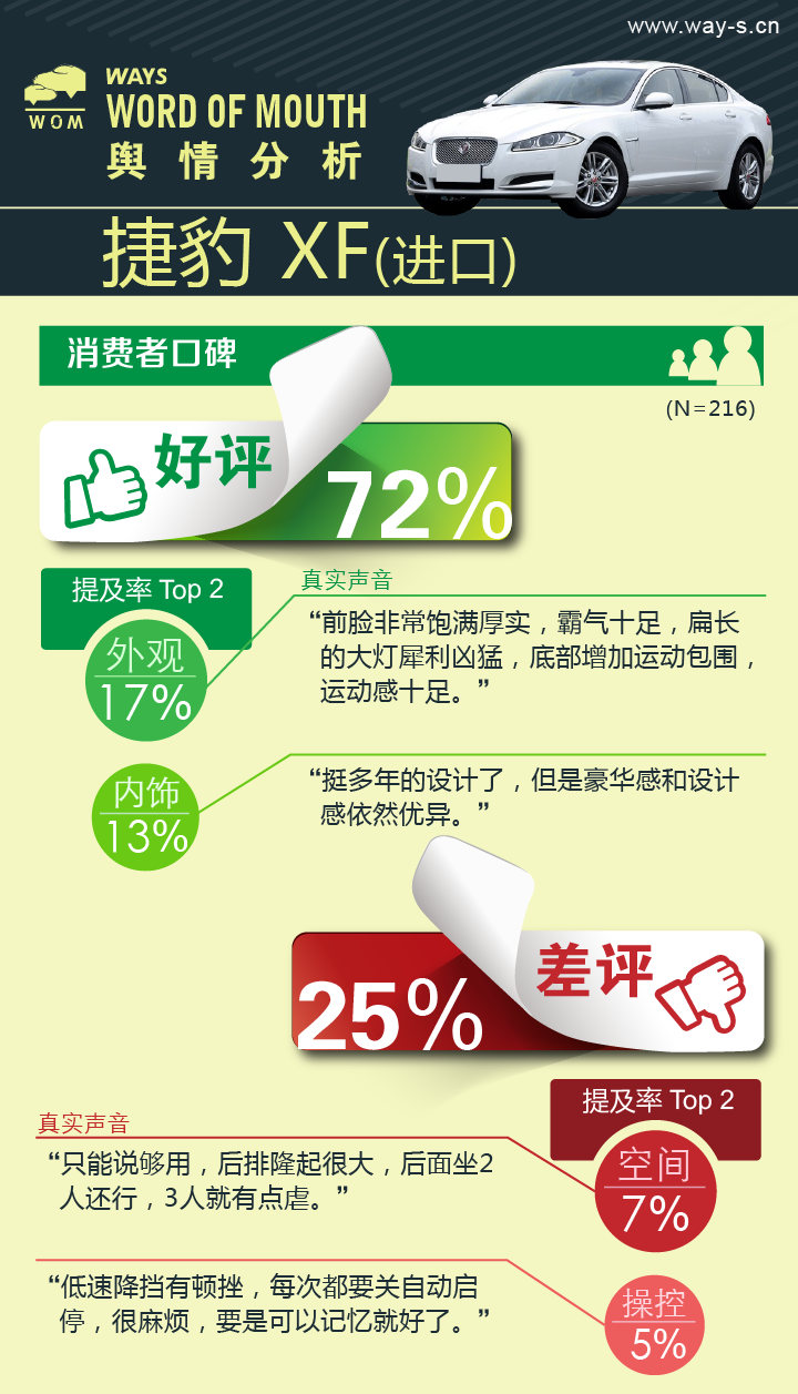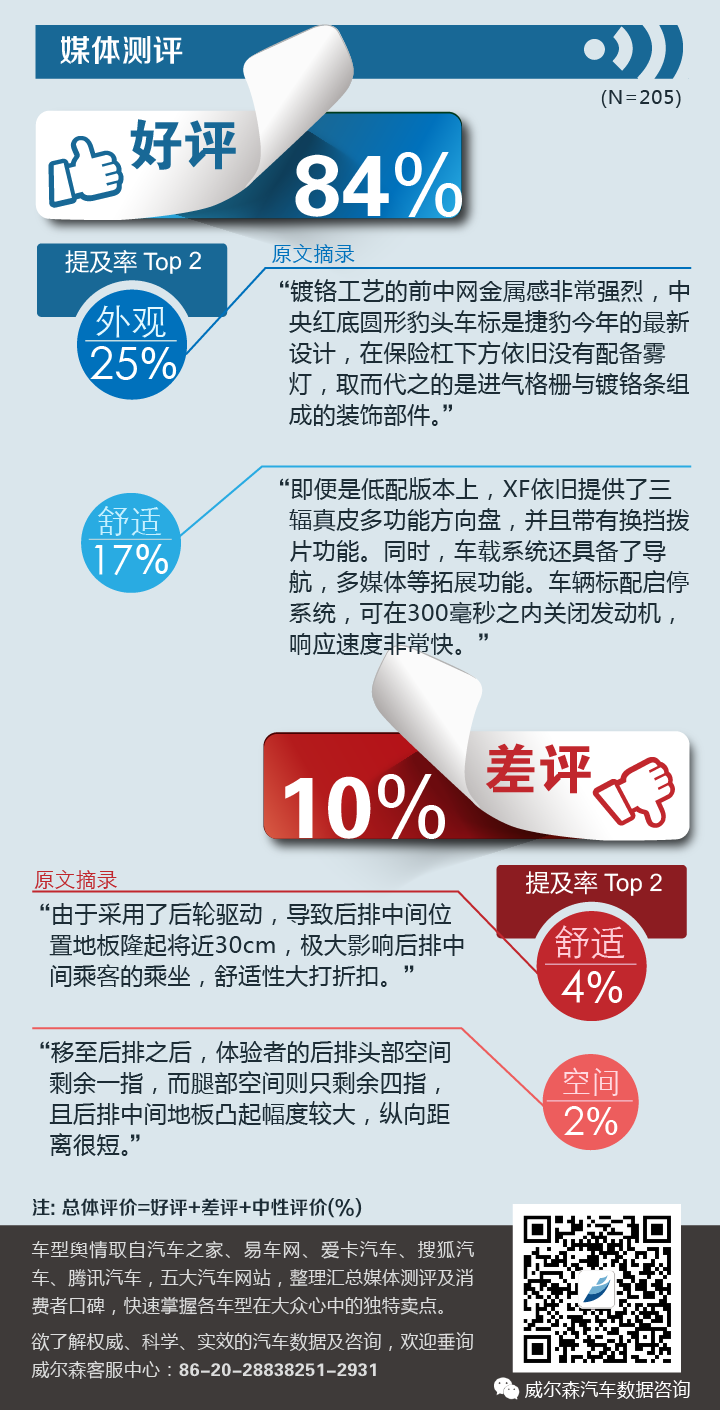 导读:五大汽车网站的媒体测评及消费者口碑,快速掌握汽车在消费者心中的独特卖点,舆情分析最新一期带大家看看捷豹XF(进口)。