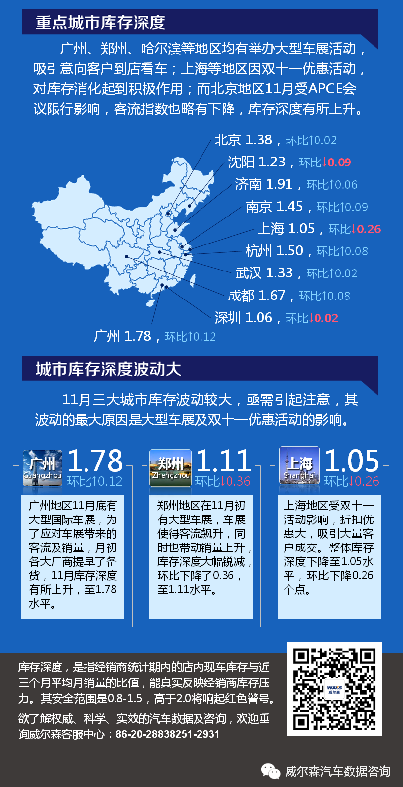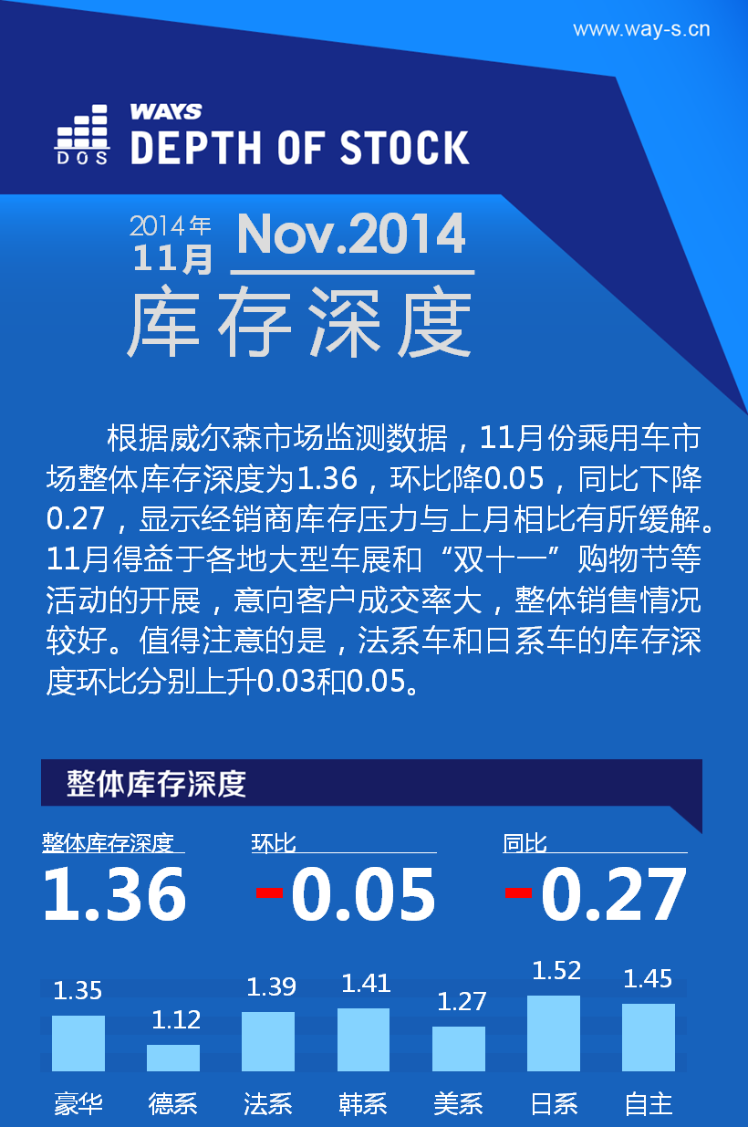 导读:根据威尔森市场监测数据,11月份乘用车市场整体库存深度为1.36,环比降0.05,同比下降0.27,显示经销商库存压力与上月相比有所缓解。