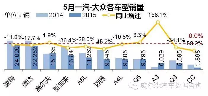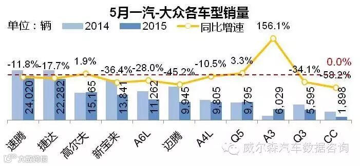 车型:仅A3表现突出、高尔夫和Q5销量微增,其余车型销量均有不同程度的同比下滑。