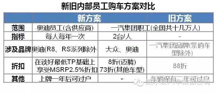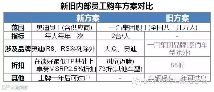 厂商做法:一汽-大众制定了更宽松的内部员工购车方案;奥迪也给出了大幅优惠的员工购车计划。