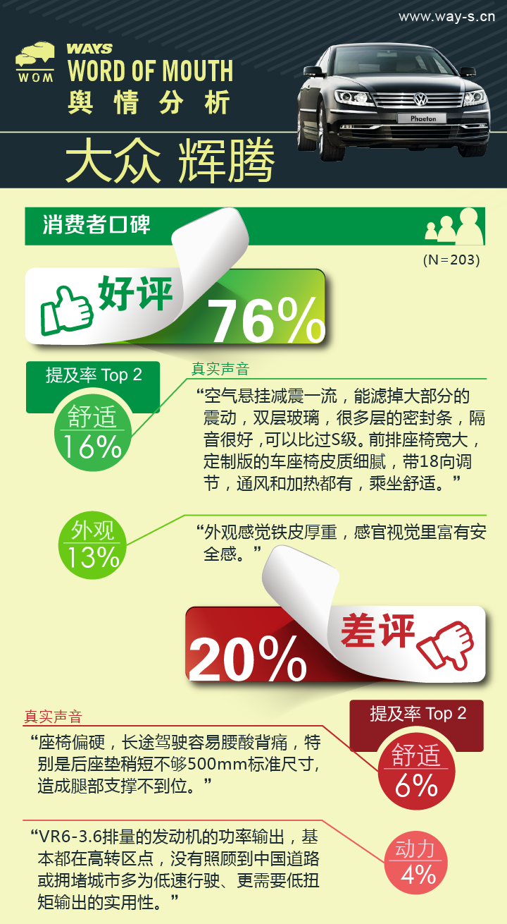 导读:五大汽车网站的媒体测评及消费者口碑,快速掌握汽车在消费者心中的独特卖点,舆情分析最新一期带大家看看大众辉腾。