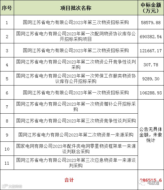截止今日,2023年上半年国网江苏省电力公司已发布11个物资批次项目中标公告,小编对此进行了汇总统计,详见下表: