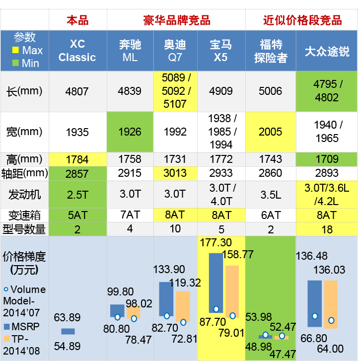 XC Classic是国内首款国产的中大型豪华SUV,以进口中大型SUV为竞品,与竞品相比,动力配置较低,价格相对低。