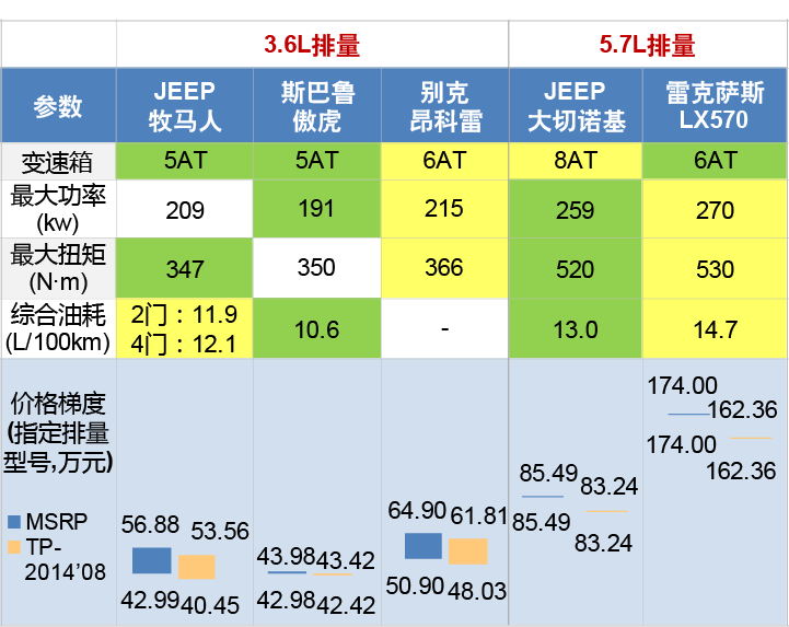9月中旬,据媒体报道,克莱斯勒旗下大排量车型将停止在华销售,如大切诺基的5.7L型号、牧马人的3.6L型号。尽管近日JEEP相关负责人已对此辟谣,但大排量车型在华销售仍面临挑战。目前国内最大排量发动机为6.4L,仅有大切诺基一款车型搭载,其在国内尚无在售同排量竞品。而搭载3.6L、5.7L发动机的JEEP SUV与主流竞品相比,价格较低,但在动力、燃油经济性方面较无优势。