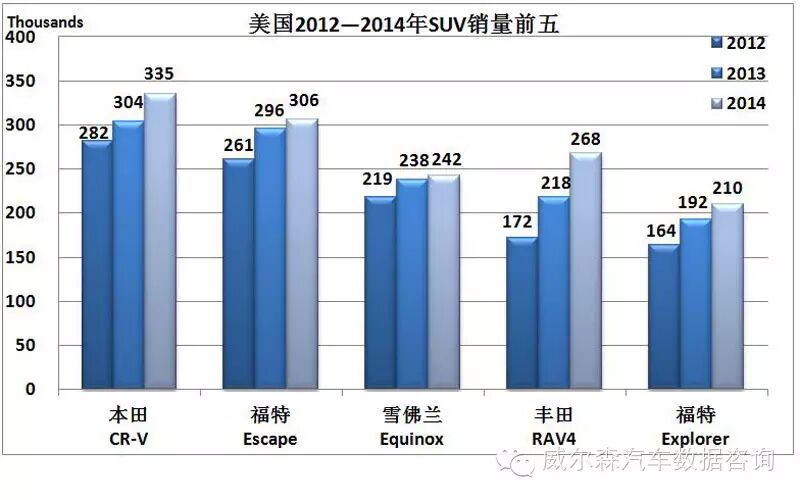 美国汽车制造业经历百年洗礼,形成了独特的汽车文化及理性的消费观念。普通中产阶级是美国汽车市场最大的消费群体,且倾向于购买经济实用的车型。美国近三年的SUV销量排名也印证了这一消费特征。在SUV市场上,本田CR-V连续三年独占鳌头,后四位也一直由福特Escape,雪佛兰 Equinox,丰田RAV4,福特Explorer占据。