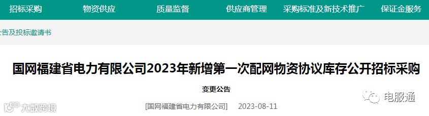 “国网福建省电力有限公司2023年新增第一次配网物资协议库存公开招标采购招标公告”已于2023年8月7日发布,其中,“1323AC-1107007-1102配电终端-TTU”分标因故取消招标,特此公告。