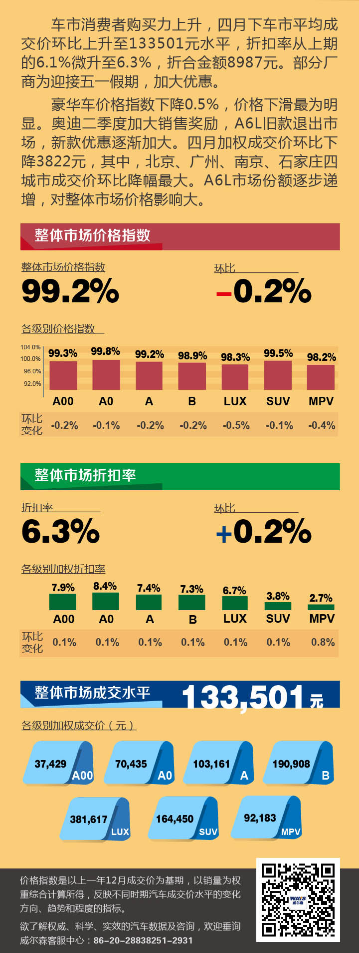 导读:车市消费者购买力上升,四月下车市平均成交价环比上升至133501元水平,折扣率从上期的6.1%微升至6.3%,折合金额8987元。部分厂商为迎接五一假期,加大优惠。