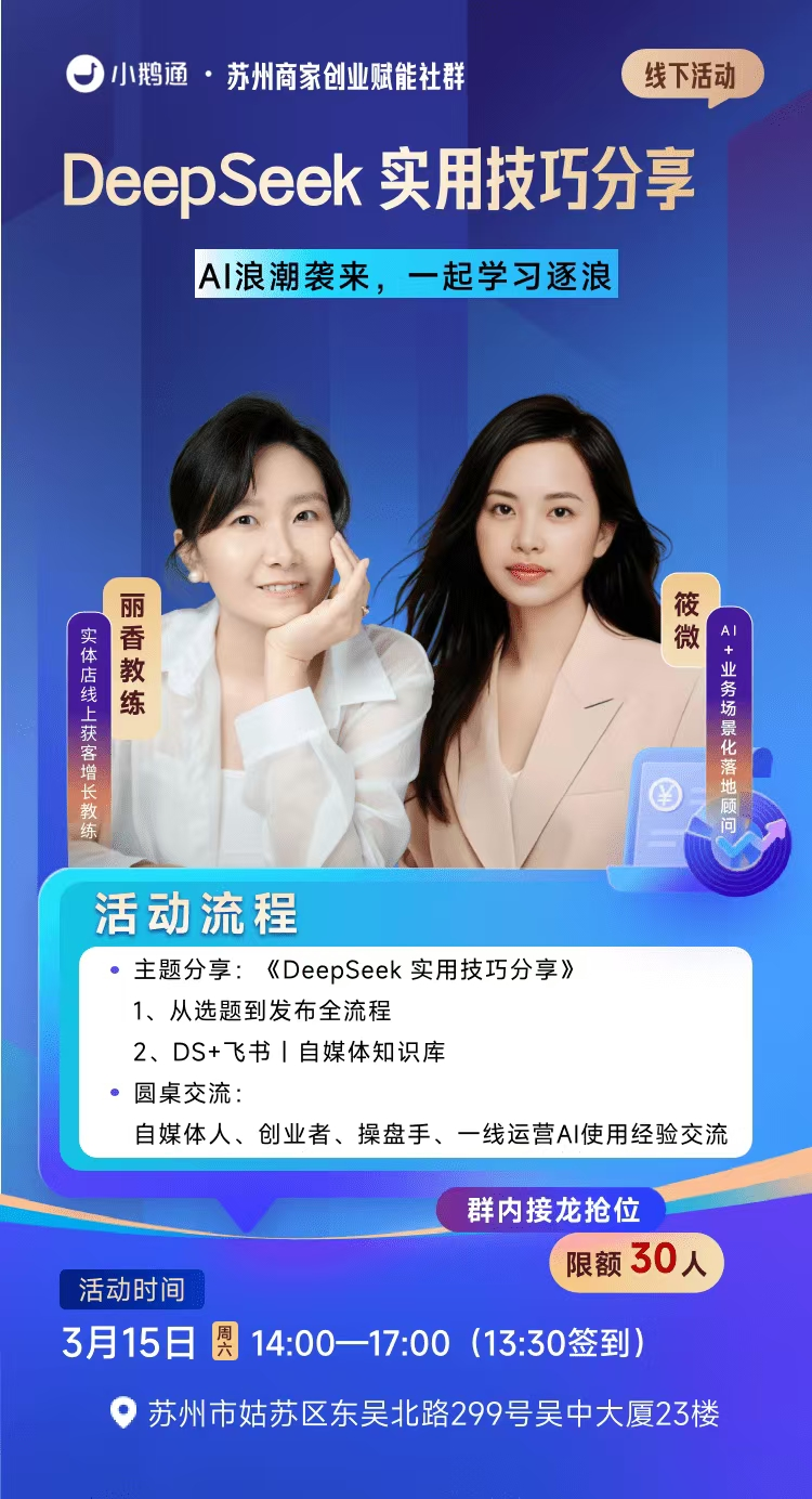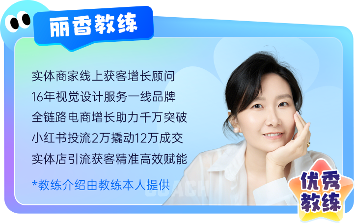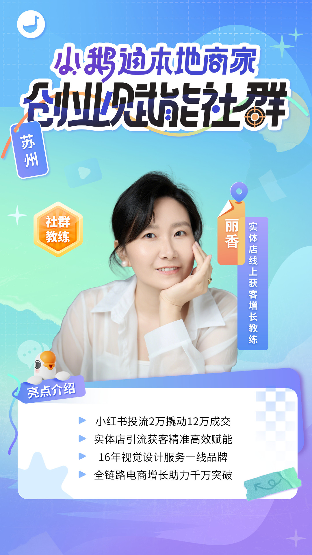 👉丽香教练从电商运营专家转型实体引流操盘手,深耕线上线下营销;她在赋能同行成长时,也通过实战磨砺实现自我突破。在与小鹅通结缘后,还为苏州社群注入创新动能,沉淀出可复用的运营方法论。