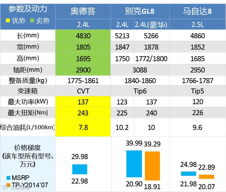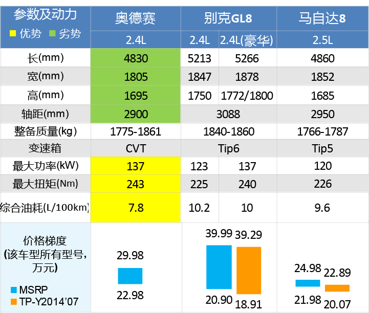 8月7日,广汽本田奥德赛正式上市,共5款车型,排量均为2.4L,MSRP区间为22.98-29.98万元。与竞品相比较,奥德赛的动力总成优于马自达8和同价位的GL8,并且其燃油经济性好,但奥德赛在车身尺寸和轴距上较同级竞品小。