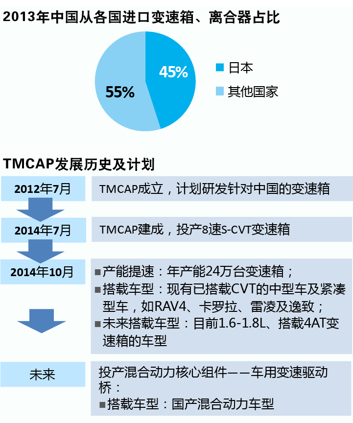 7月30日,丰田汽车(常熟)零部件有限公司(简称TMCAP)正式开业,丰田宣布将首次在日本之外生产变速箱。TMCAP将首先投产针对中国消费者和道路环境进行开发的8速S-CVT变速箱,搭载于中型车及紧凑型车,未来将投产混合动力中的核心组件——车用变速驱动桥。