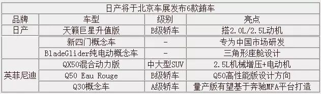 日前从日产以及英菲尼迪官方了解到:日产与英菲尼迪双品牌将有包括天籁巨星升值版车型在内的6款新车亮相北京车展。