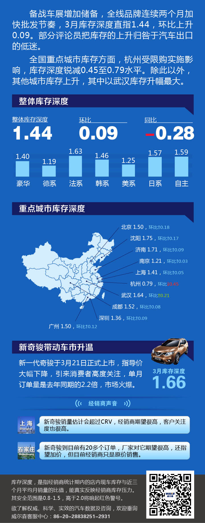 导读:备战车展增加储备,全线品牌连续两个月加快批发节奏,3月库存深度直指1.44,环比上升0.09。