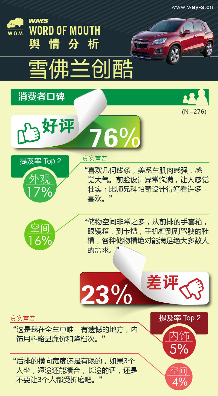 导读:五大汽车网站的媒体测评及消费者口碑,快速掌握汽车在消费者心中的独特卖点,舆情分析最新一期带大家看看雪佛兰创酷 。