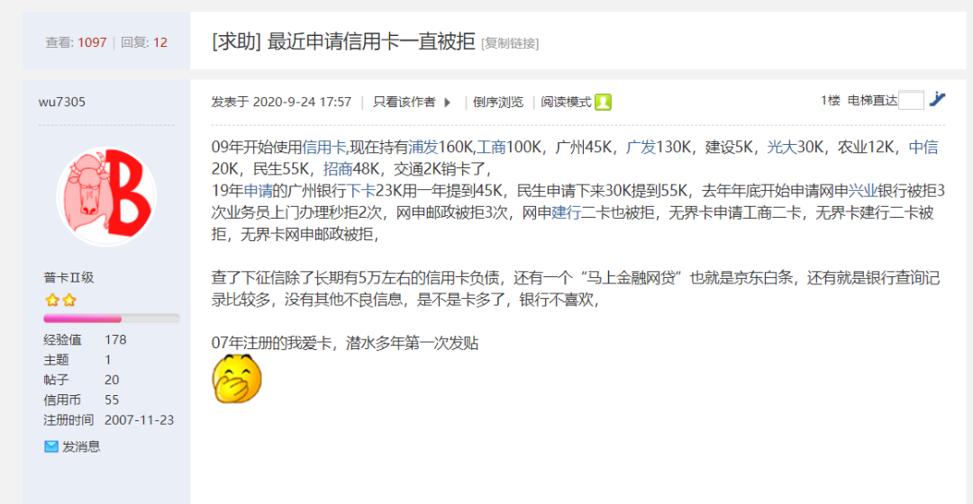 从去年下半年开始,黄博文发现,论坛上的帖子,已鲜少再有撸哪个网贷口子的帖子,但是,“钻银行空子”“撸银行口子”“撸银行信用卡”的帖子,却开始急速增加。