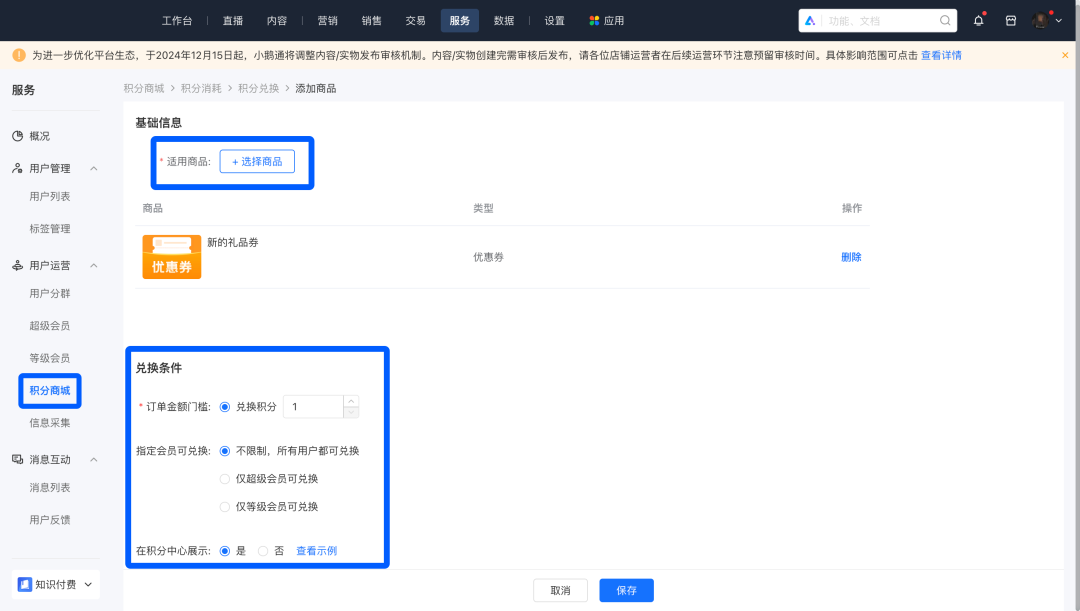本次升级,我们新增了支持积分兑换礼品券,商家朋友们可以选择积分兑换的适用礼品券。