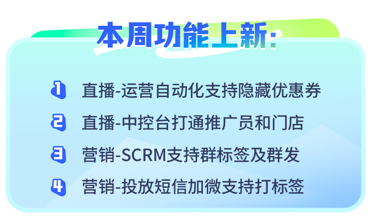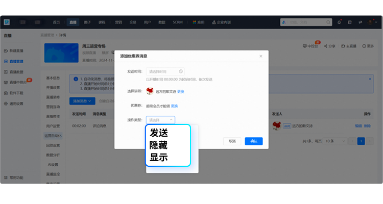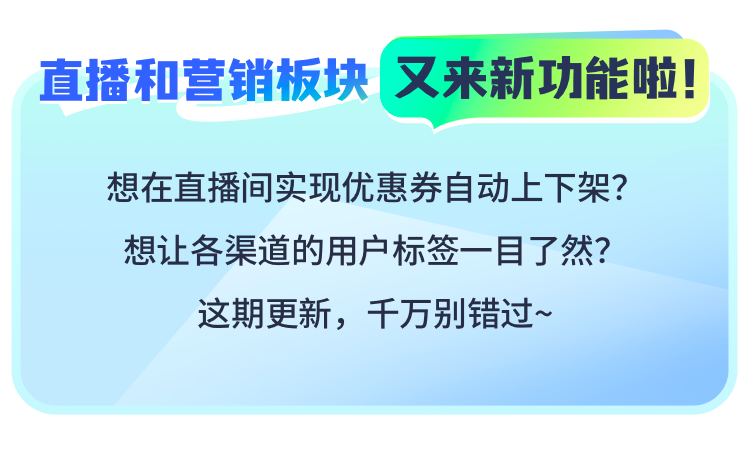 本次升级,直播自动化运营的功能中,优惠券显示/隐藏的状态支持设置啦~直播优惠福利限时提供,达到用户和商家朋友的双赢~