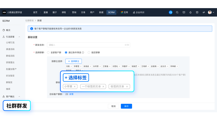本次升级,我们支持对群聊打上标签!群主可以根据群类型、群活跃度等情况打上对应的标签,以便分层运营;还可以通过群标签筛选,帮助运营人员快速定位到对应的群聊,进行批量触达运营活动。