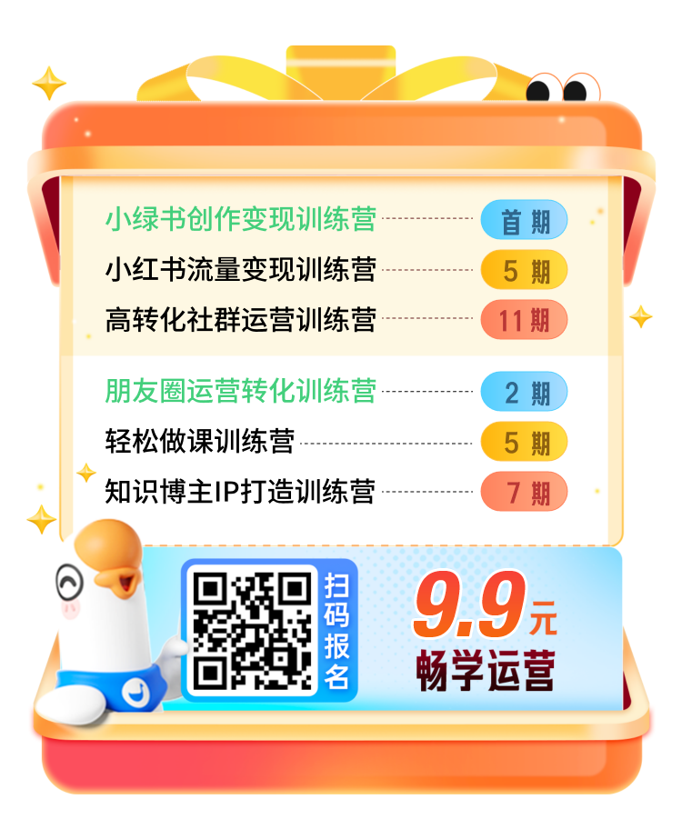 点击下方海报,立即领取小鹅通9.9训练营福利!完课还可领超值干货包噢,快拉上你的好友一起享受限时特惠: