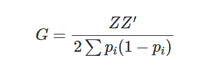 Z为SNP标记的设计矩阵;公式中,pi为每个位点的最小等位基因频率。公式中分母部分,是为了使G矩阵与A矩阵的尺度相一致。scales G to be analogous to the numerator relationship matrix A.