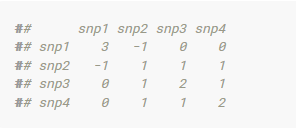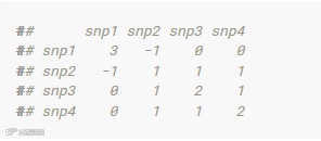 M’M对角线数字为3、-1、0、0,分别表示四个位点纯合基因型的个体数。譬如位点snp1,有3个个体基因型全部为纯合;位点snp2,有1个个体基因型为纯合。