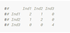 MM’对角线数字为2、2、4,分别表示三个个体基因型为纯合的位点数。譬如Ind1,四个位点中有两个位点的基因型为纯合类型(AA和GG),而Ind3个体四个位点基因型全部为纯合类型。