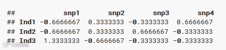 把基因型矩阵转换为基因含量矩阵,具体参数用基因型中最小频率等位基因的个数表示,即0、1、2。因此我们称这个矩阵为MAF矩阵。