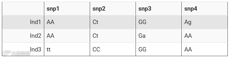 譬如有3个二倍体个体,4个SNP位点。对于每个位点,小写等位基因表示其出现频率最低。