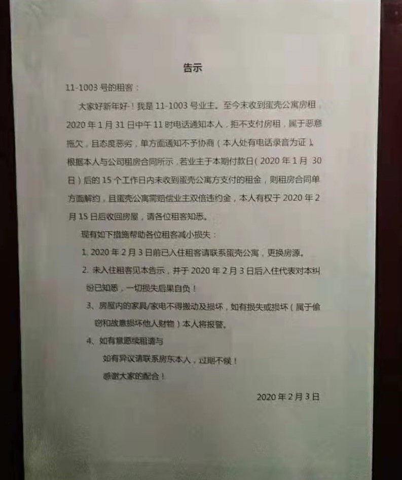 2月3日,长租公寓蛋壳发布了致租客的一封信,称要给租客减免租金。