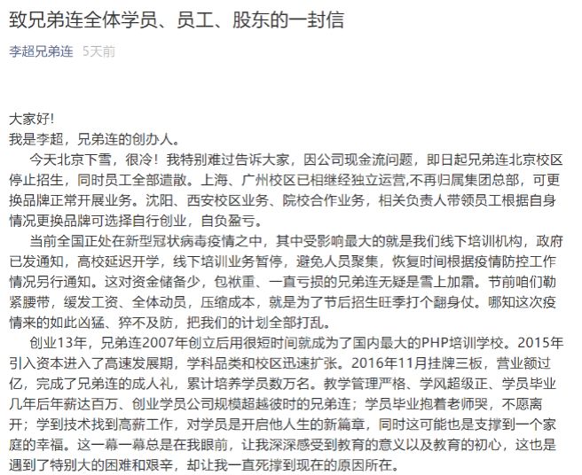 2月6日夜,作为经营13年的教育机构“兄弟连”的创始人,李超发布了《致兄弟连全体学员、员工、股东的一封信》,正式宣告品牌“破产”。