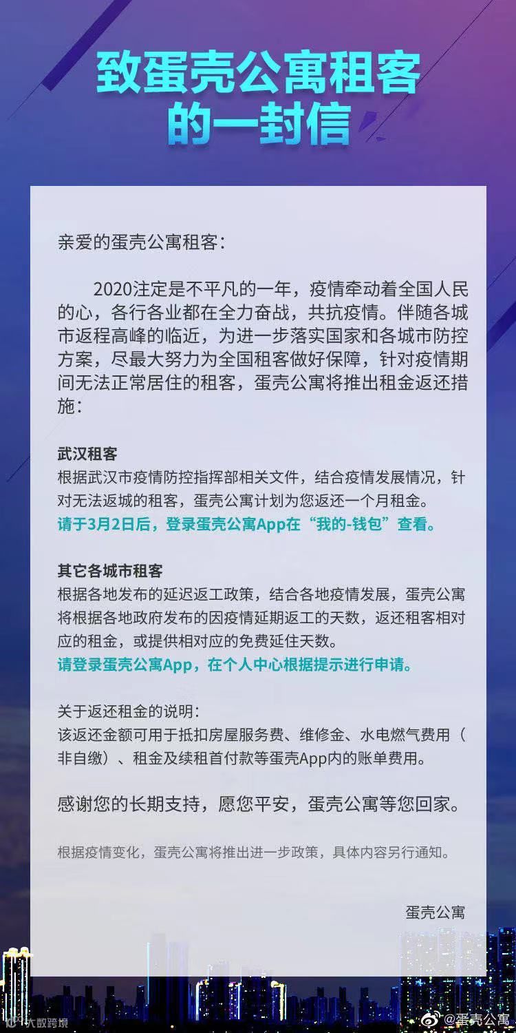 信中写道,他们将为因疫情不能返回武汉的租客,返还一个月租金;为其他城市的租客,返还延迟复工天数相对应的租金,或免费延长其居住天数。