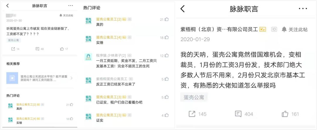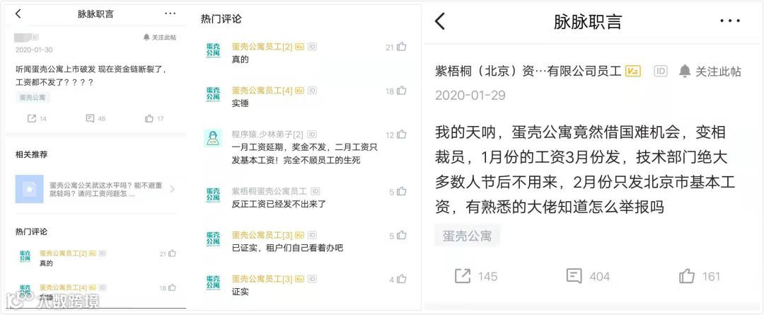 脉脉上有人透露蛋壳公寓拖欠工资、资金链断裂的情况