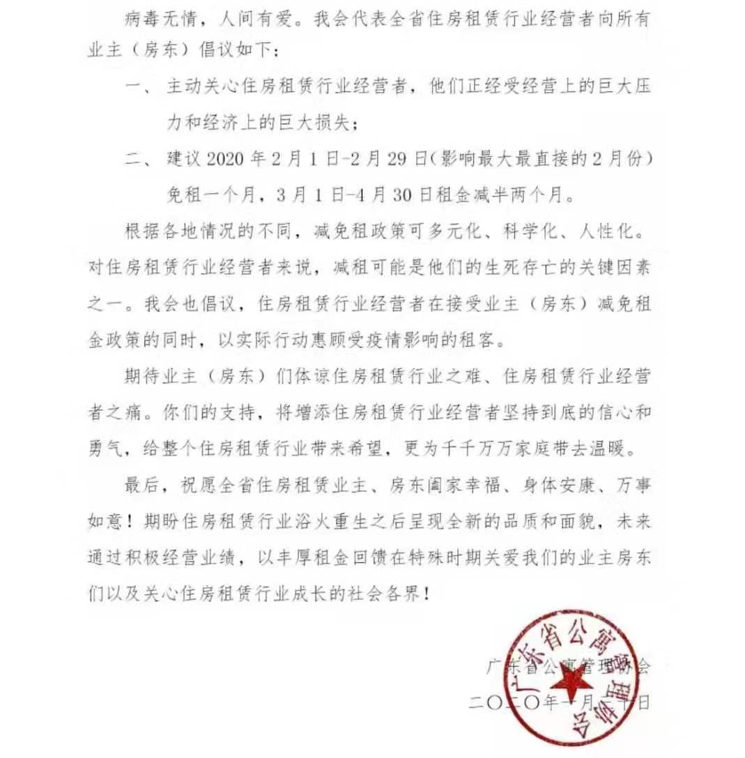 1月30日,广东省公寓管理协会发起了号召,倡导业主2月免租一个月,3月和4月租金减半。