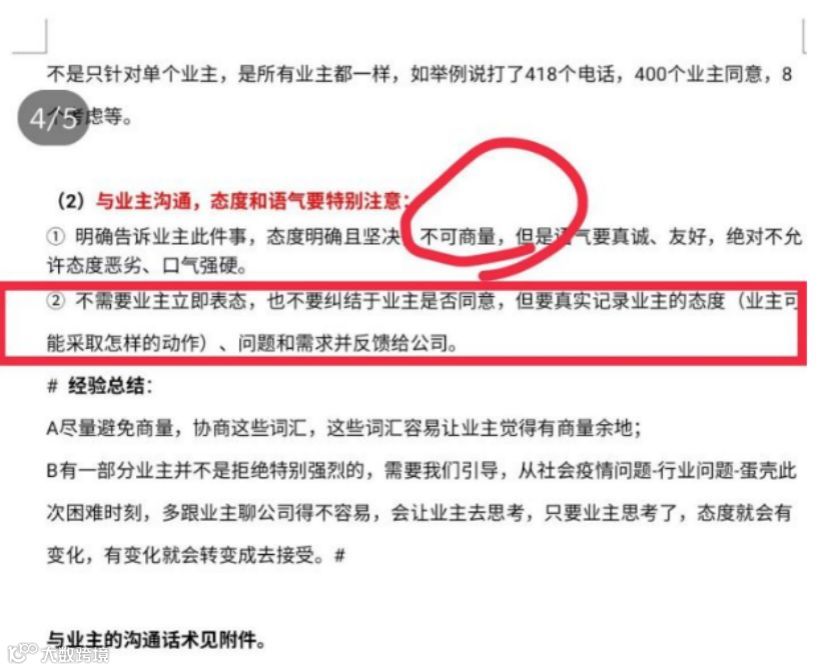 一份在网络流传的蛋壳内部文件显示,蛋壳要求员工与业主沟通时,应当“态度明确且坚决,不可商量”。