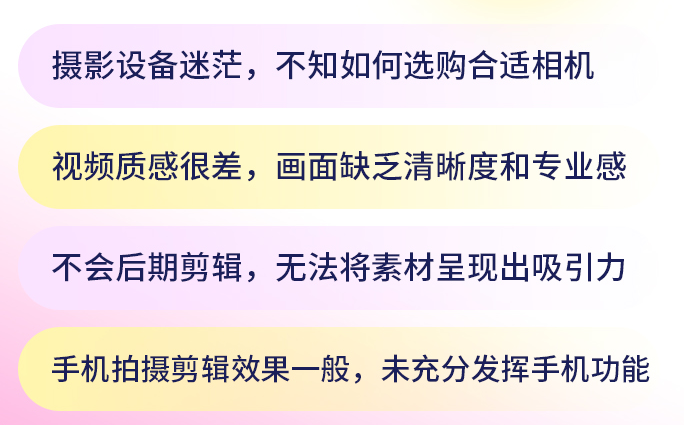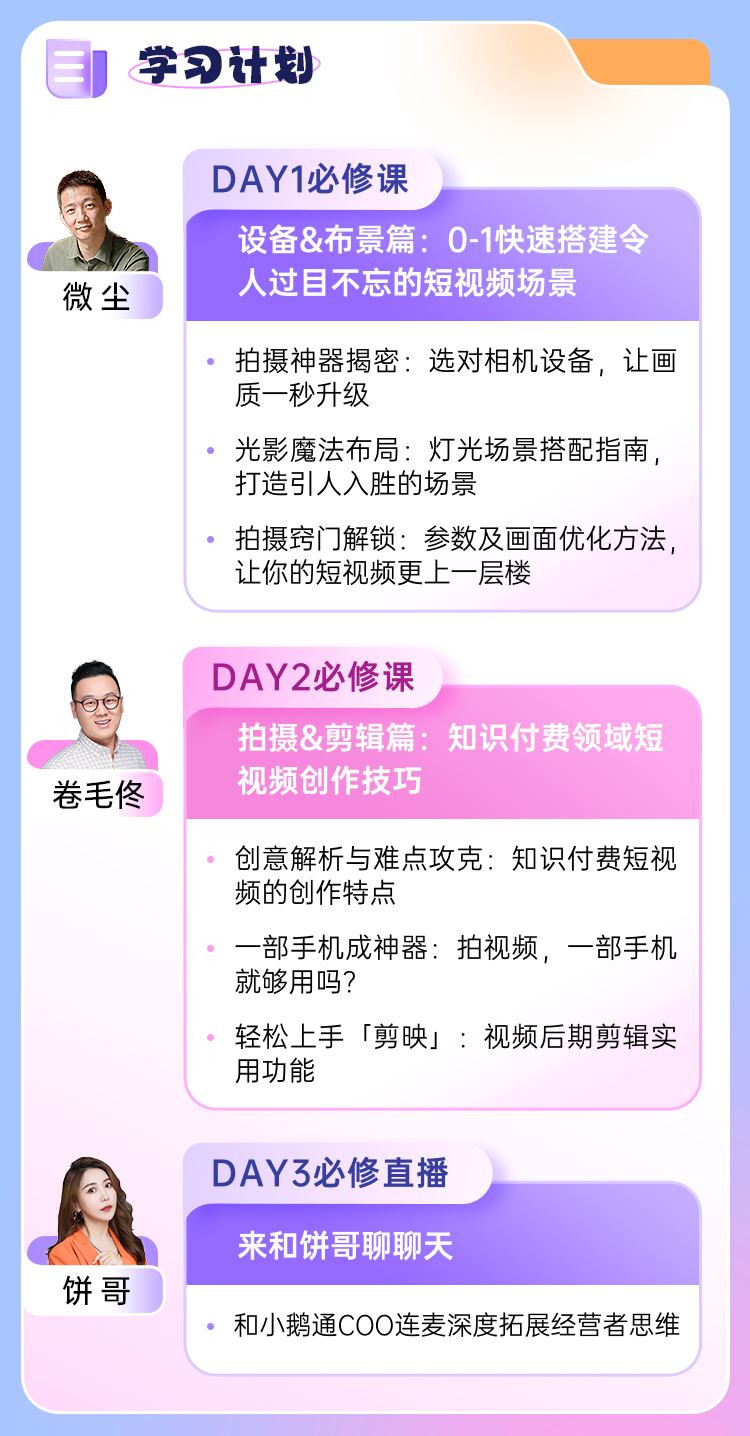 本次特训营为期3天,包含2天必修课,1场必修直播。通过“设备&布景”和“拍摄&剪辑”2大篇章的递进式学习,帮助大家掌握短视频的拍摄思路及剪辑过程。