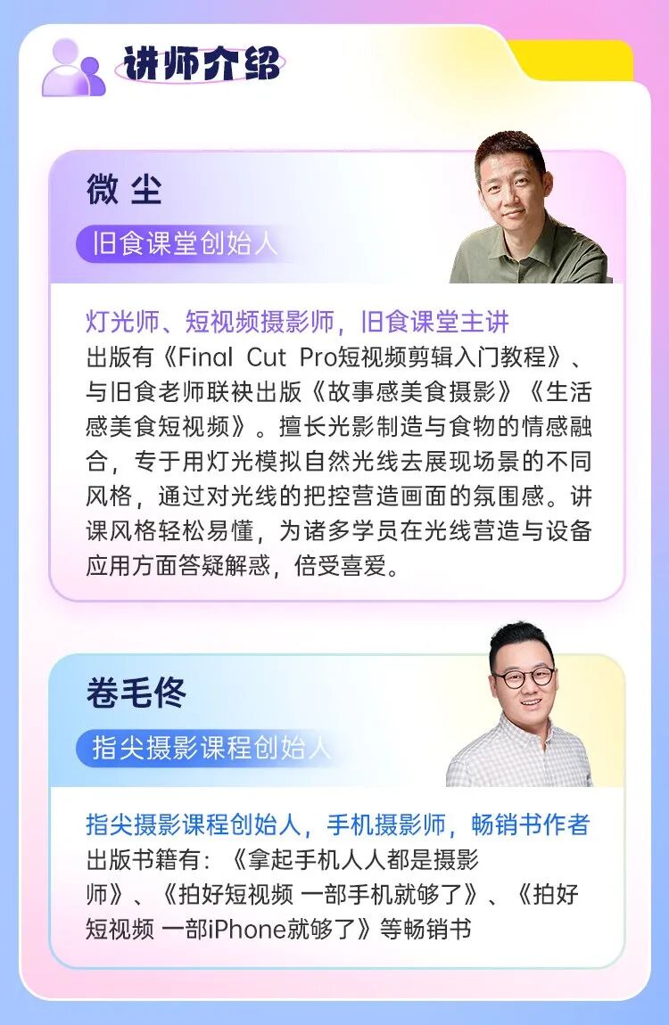 本次短视频营,我们邀请了2位行业大咖,担任本次营期的实战讲师,他们都是玩转摄影、短视频和知识付费的超级玩家。