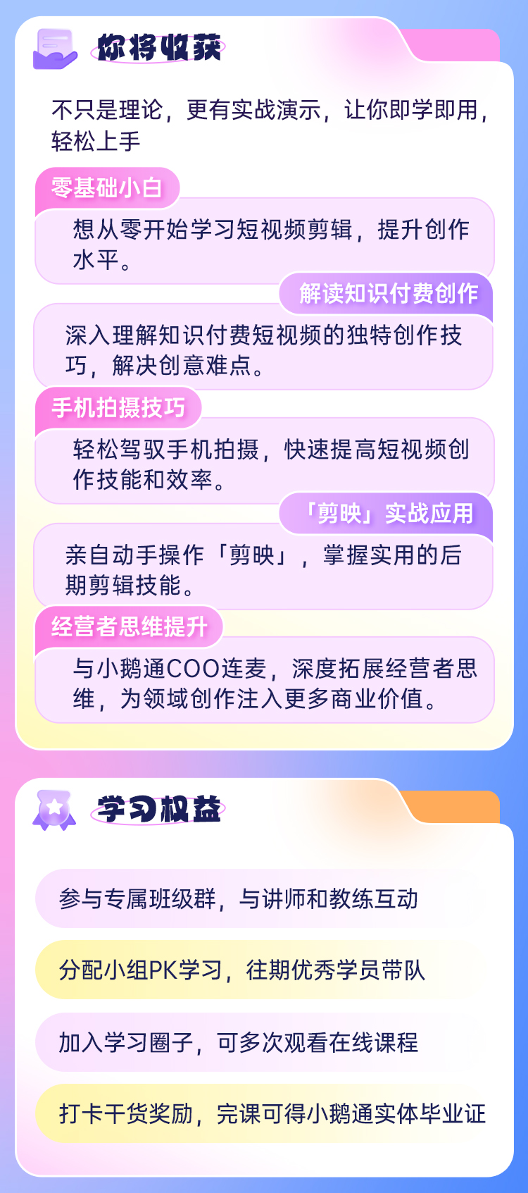 本次训练营特别面向零基础小白、手机拍摄爱好者、创意短视频爱好者、知识付费创作者、企业经营者和品牌运营者。