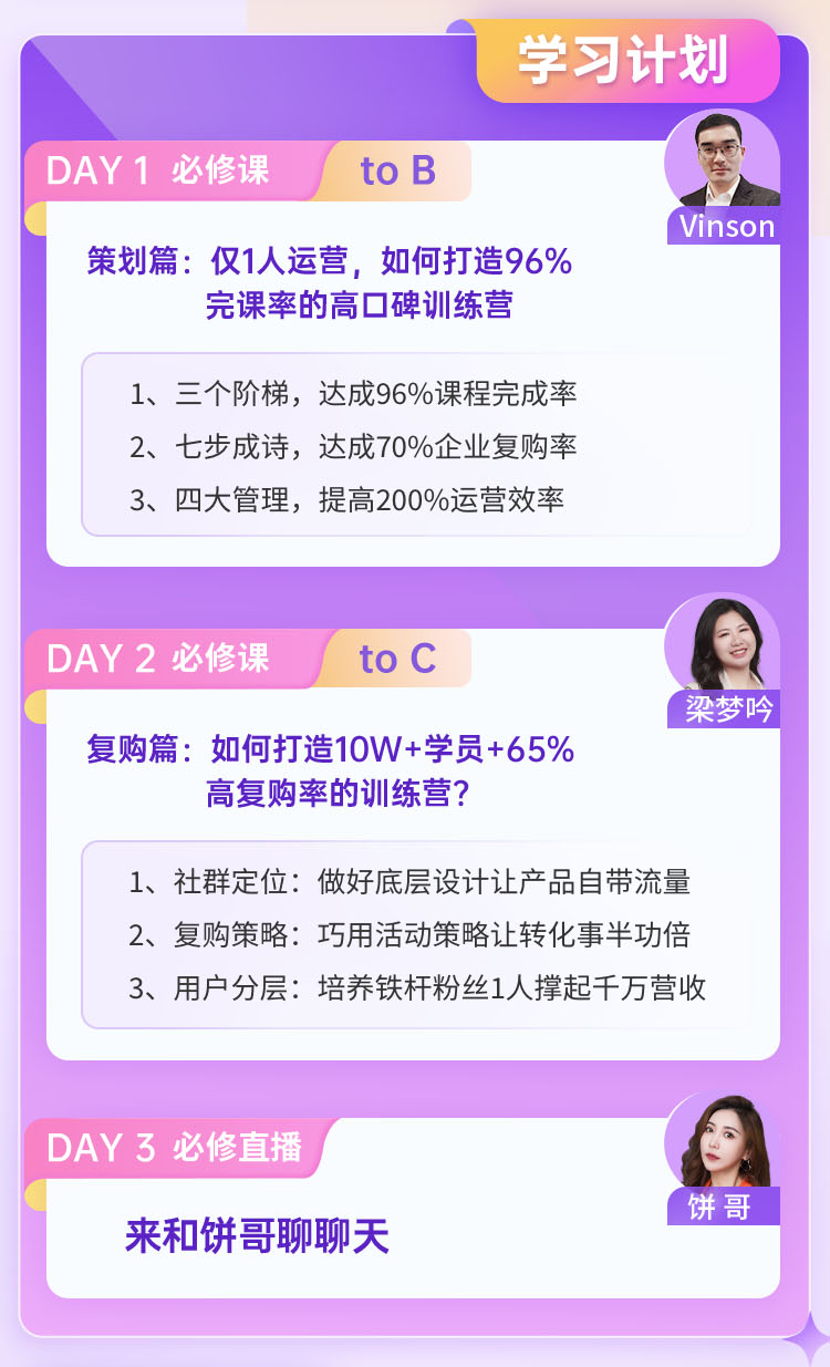3天系统性的特训课程,将帮你快速了解一期训练营从策划到落地运营过程,打造畅销、高复购和高口碑的训练营产品。