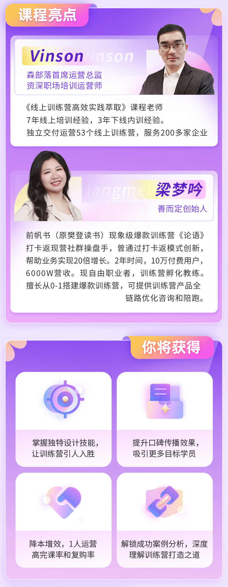 从“策划方向”、“复购方向”2大篇章的递进式学习,帮助大家掌握训练营打造的思路及落地运营全过程。